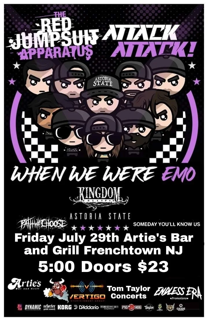 Come on out to Arties in Frenchtown and catch Attack Attack, Red Jumpsuit Apparatus and Kingdom collapse. Special guests Astoria State. This is planned as an outdoor event weather permitting, event will move indoors if its inclement.