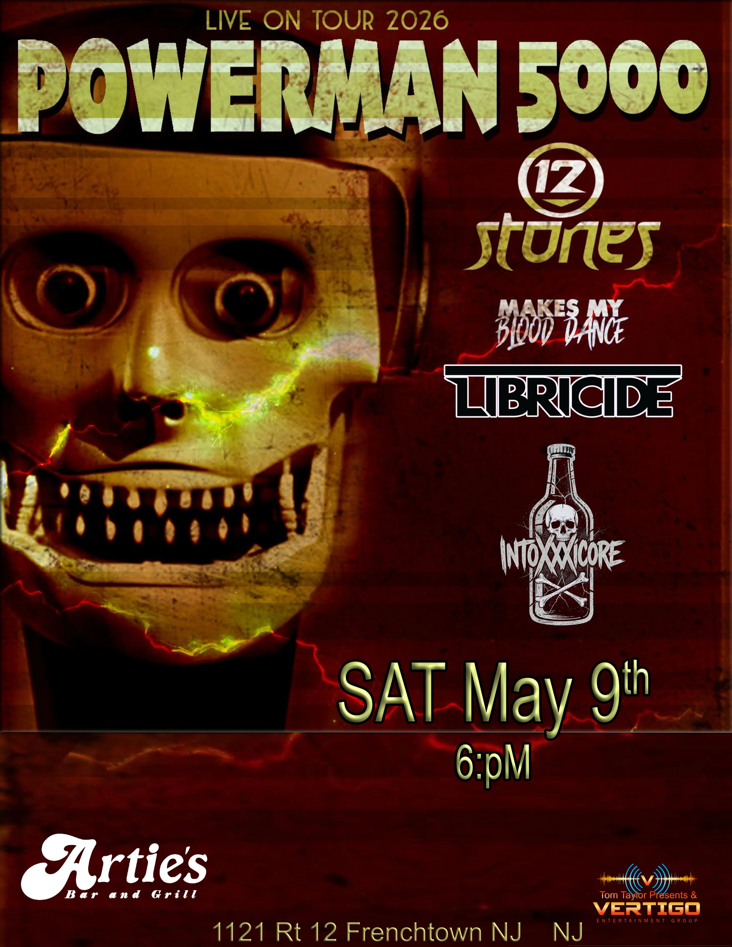 Don't Miss POWERMAN 5000 Live! Get ready to rock out with POWERMAN 5000, 12 STONES, and more at ARTIES! This in-person event promises an epic night of killer tunes, energetic vibes, and unforgettable performances. Whether you're a longtime fan or just into great music, this is the place to be. Grab your friends and come enjoy an electrifying evening where the stage comes alive! Special guests to be announced. General Admission show.