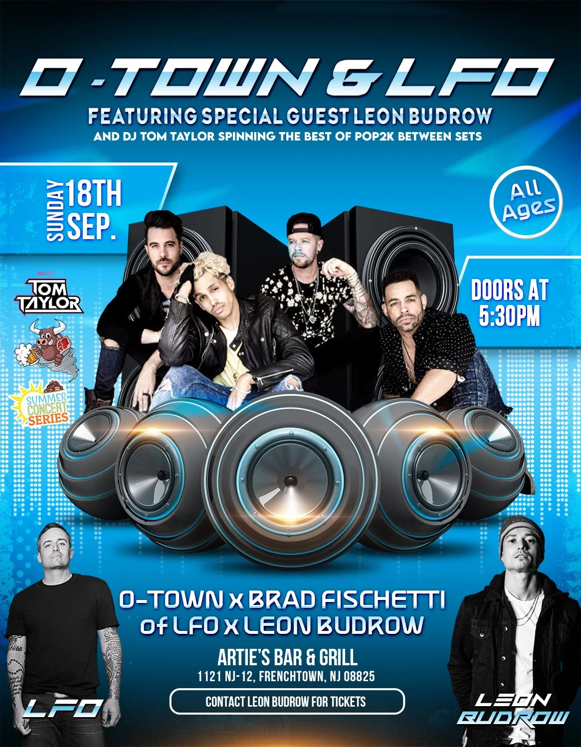 Back to All Events O-TOWN with Brad From LFO Live at Arties Sunday, September 18, 2022 5:30 PM 10:45 PM Artie's Bar & Grill 1121 New Jersey 12 Frenchtown, NJ, 08825 United States (map) Google Calendar ICS O-Town formed from the first season of the reality television series Making the Band in 2000. O Town released a new album in 2019 and are out to support that and all of their hits including " Nothing at all " and more. Joining them is Brad from LFO.CLICK FOR TICKETS