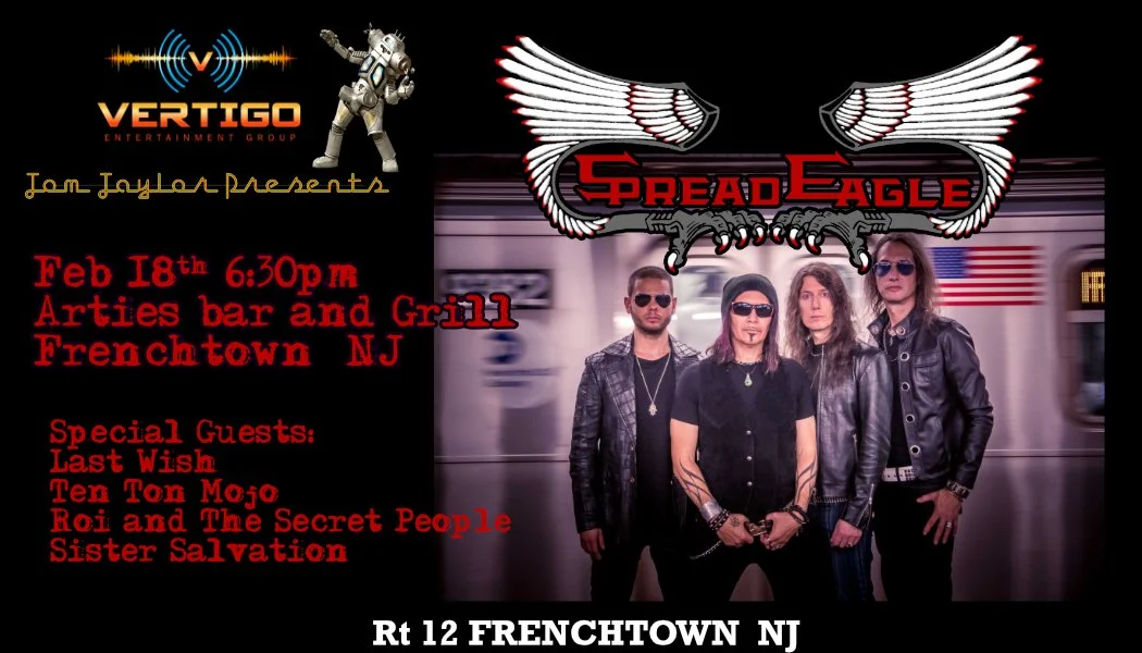 Do not miss SPREAD EAGLE as they hit the stage at Arties. Touring for their new release Subway to the stars. Their sound is as crunchy and NYC metal as they make it. Joining them are Sister Salvation - Last Wish - Ten Ton Mojo and Roi and the Secret People.